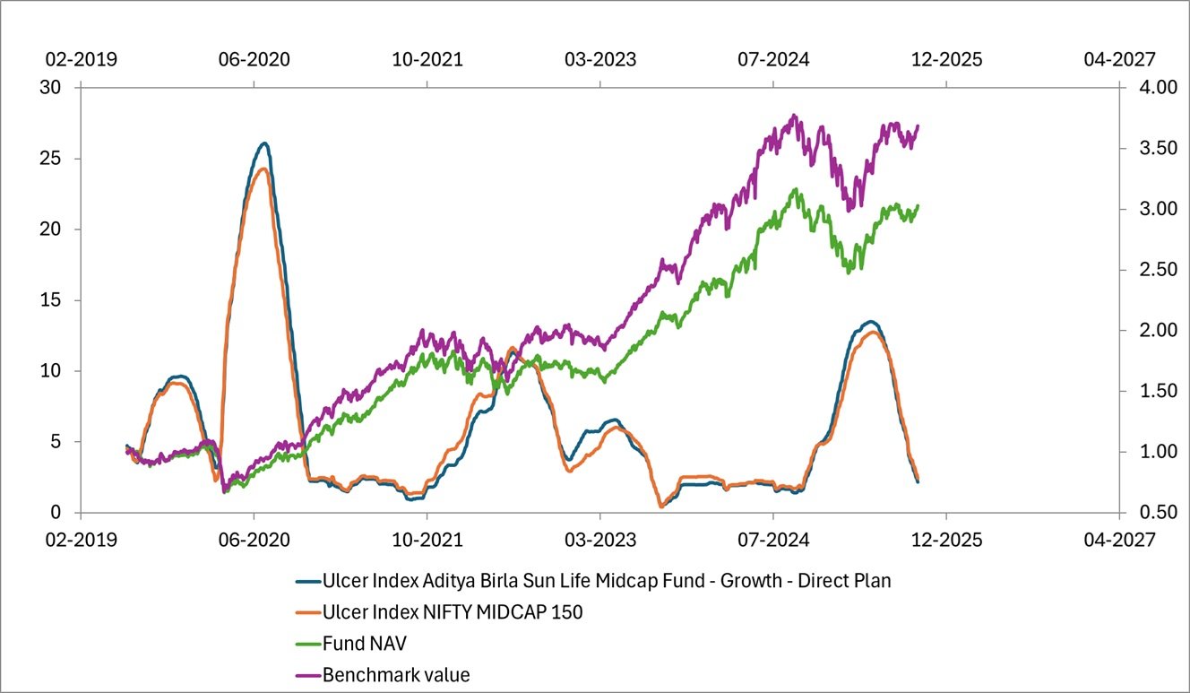 Between January 1, 2013, and Sep 17, 2025, there are 1896 5-year rolling returns. The fund has solely outperformed the index 88 out of 1896 instances. Thus, the rolling return outperformance consistency over seven years is 88/1896 = 4.64% indicating poor efficiency (the corresponding rating for the Parag Parikh Fund is 100% as of Sep 2025). You’ll be able to see the Ulcer rating for the midcap fund within the screenshot under.