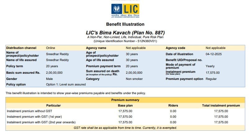 I’ve checked the premium illustrations on LIC’s official portal. The premium quote provided by LIC for Bima Kavach plan is Rs 17,575 p.a.