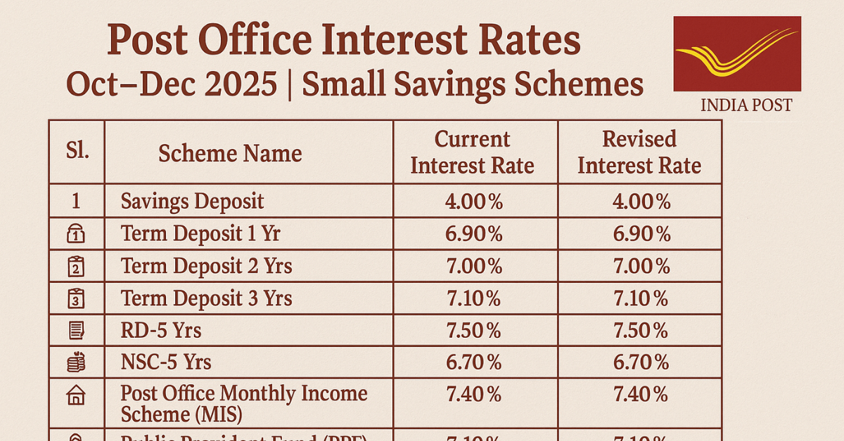 Put up Workplace Small Financial savings Scheme rates of interest Oct–Dec 2025 stay unchanged from July–Sep 2025. Newest PPF, SCSS, SSY, NSC, KVP, RD, FD charges.